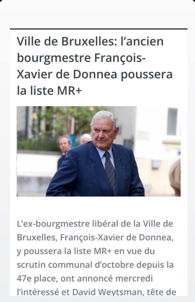 La chaîne régionale bruxelloise a annoncé que François-Xavier de Donnea poussera la liste MR+ à la Ville de Bruxelles aux prochaines élections communales du 13 octobre 2024.